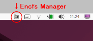 上手くインストール出来るとデスクトップ右上のトレイに「Encfs Manager」のアイコンが表示されます。(下記イメージ参照) なおうちのデスクトップは「Classic GNOME Flashback」です。