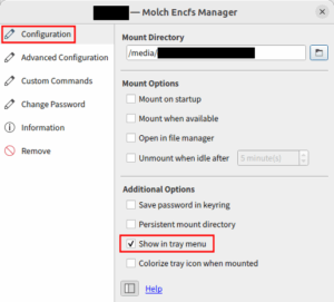 Encfs Managerを開き左側の「Configuration」を選択。右側にいろいろと設定項目が並びますが、「Show in tray menu」のみチェック。それ以外は全てチェックを外しています。(下記イメージを参照)